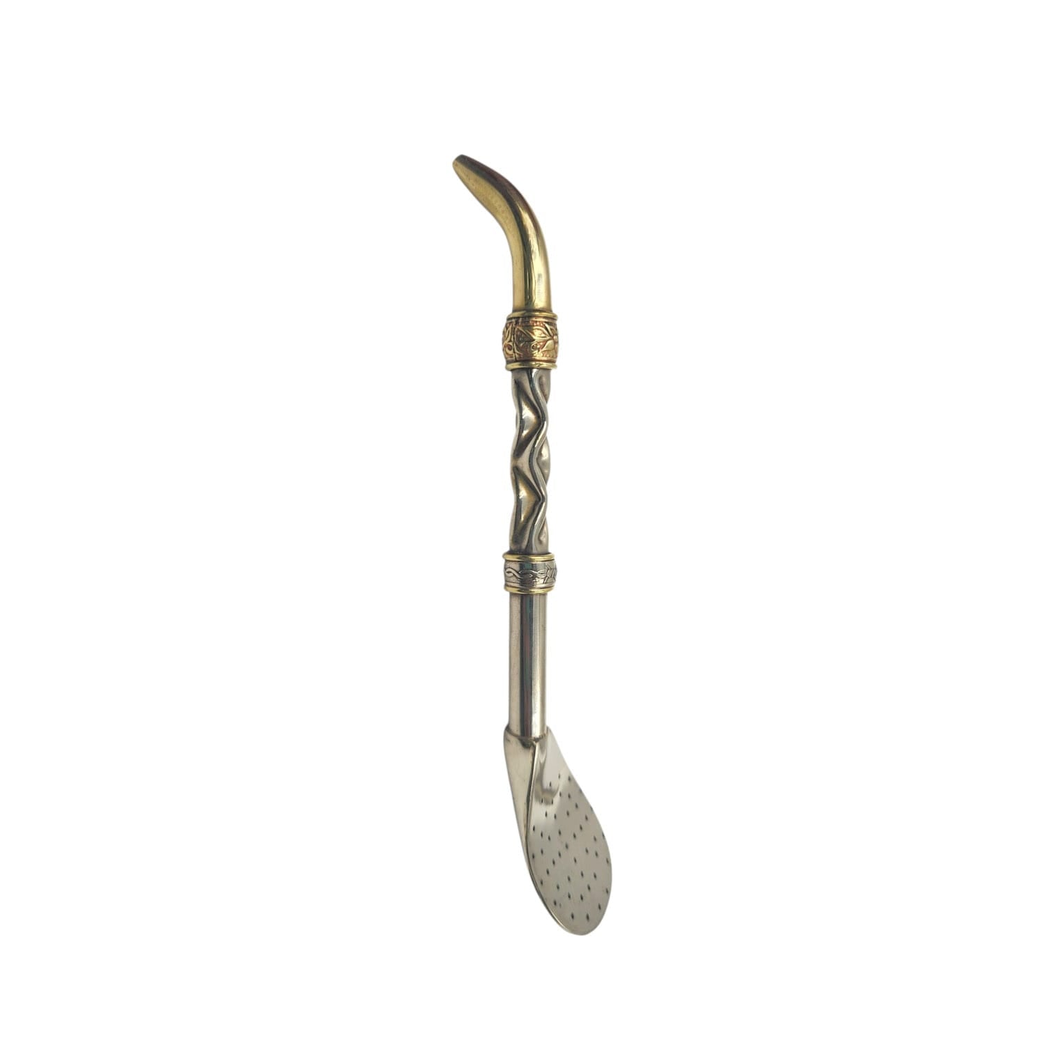 Hermoso bombillón de alpaca pico curvo y caño cincelado con anillos en bronce cincelados.