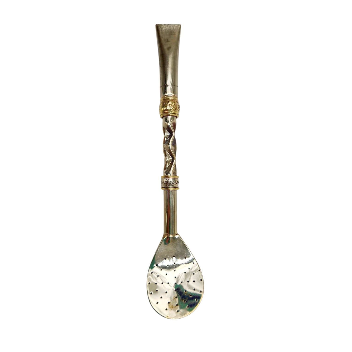 Hermoso bombillón recto de alpaca con boquilla y anillos en bronce cincelados caño diseño especial plegado. Terminación cucharita.