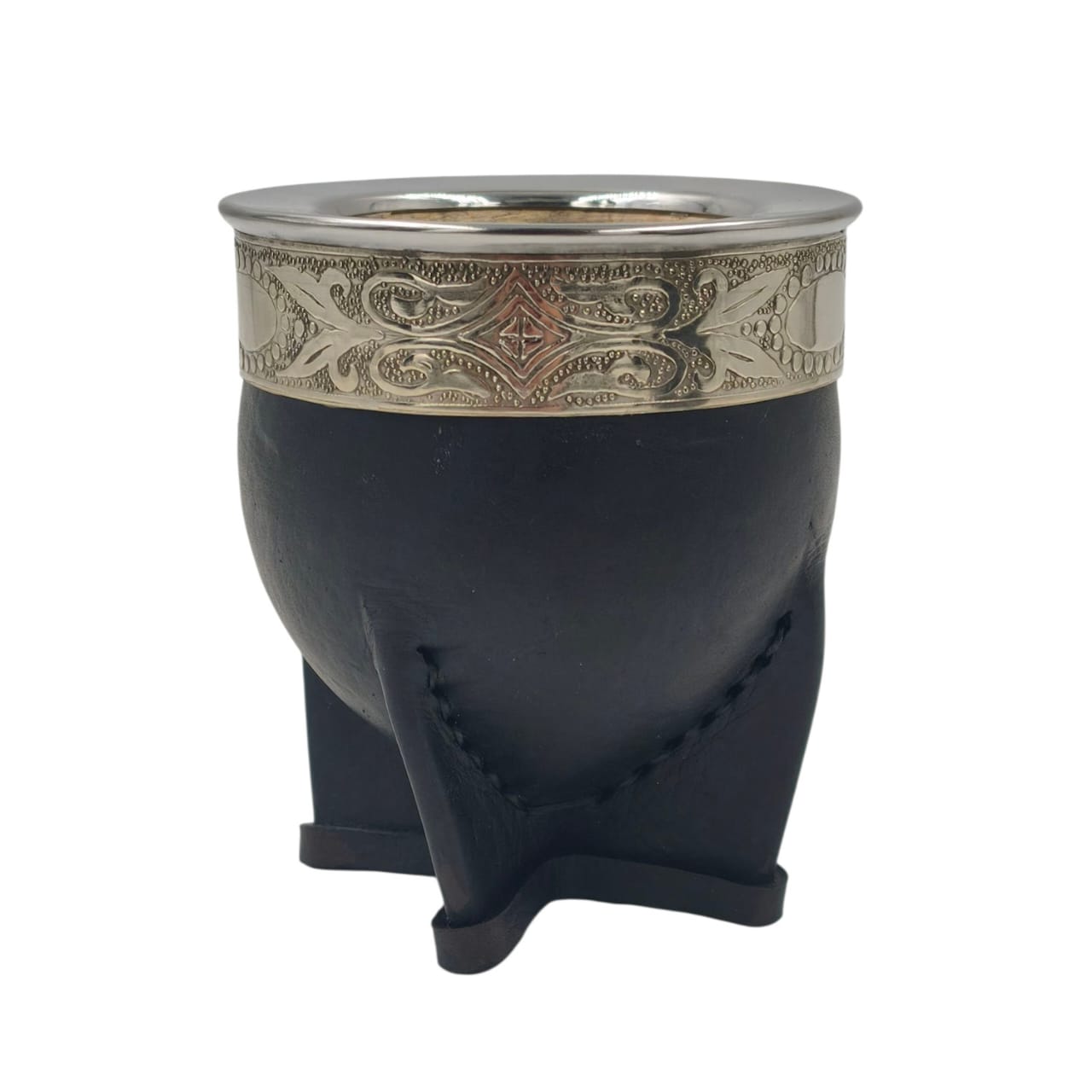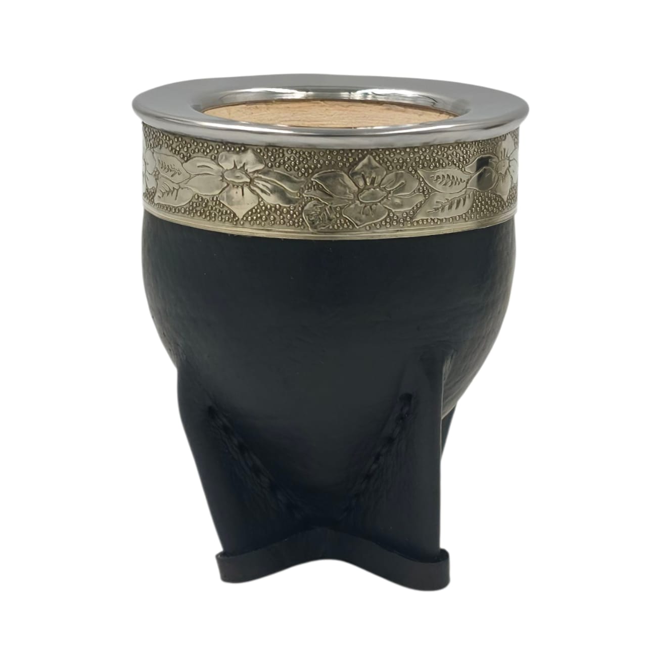 Mate de calabaza forrada en cuero con fleje en alpaca y virola de acero lisa que permite personalización en grabado láser.