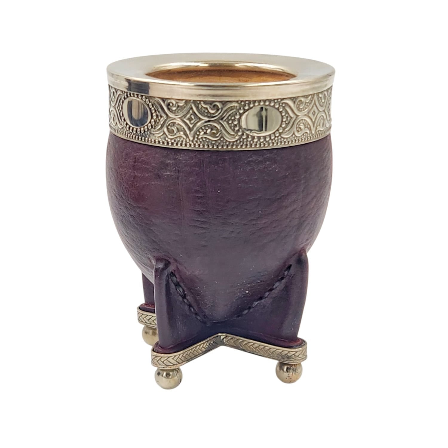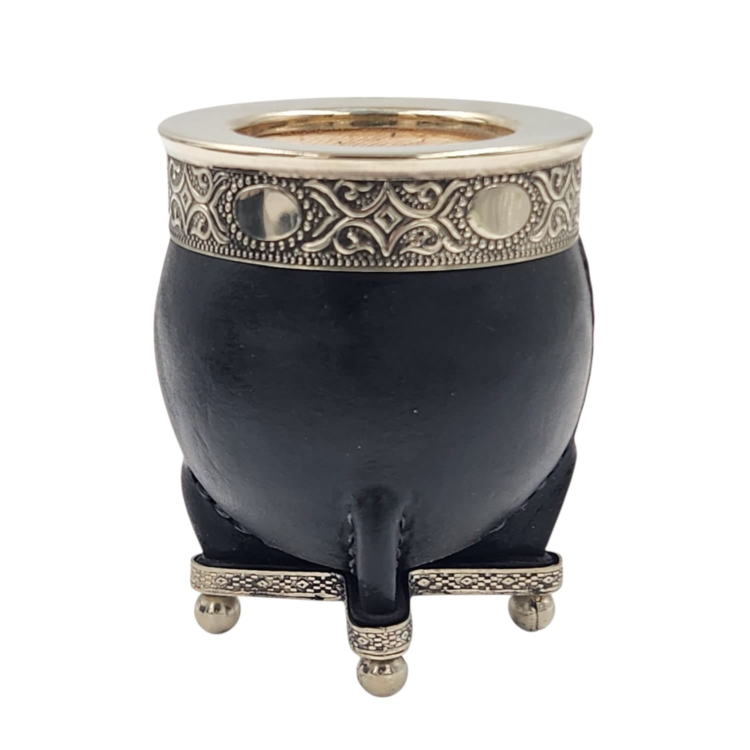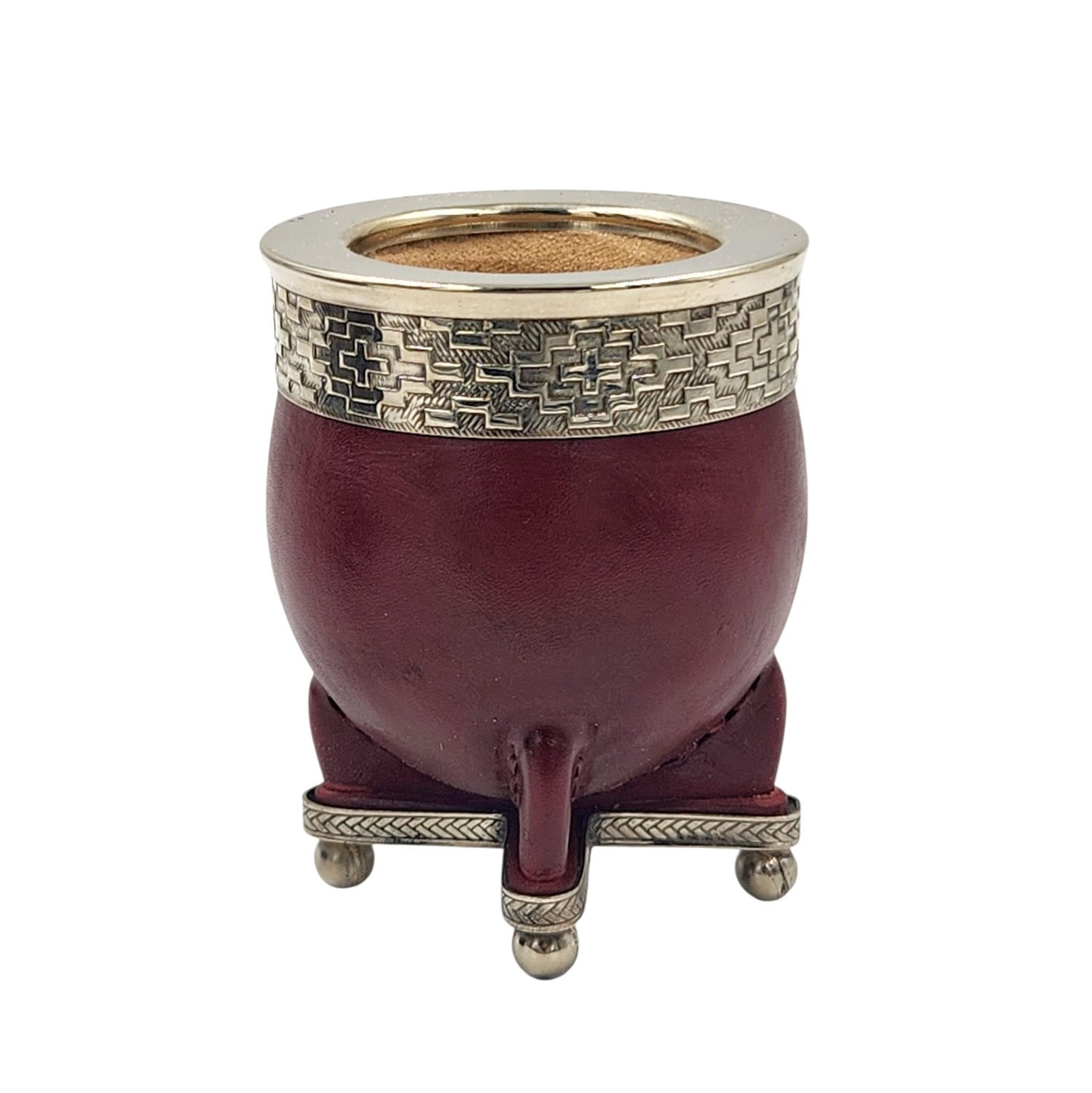 Mate de calabaza seleccionada revestida en cuero genuino con terminación de costuras de primera calidad. Su virola y fleje es de alpaca. La base es de alpaca maciza cincelada.