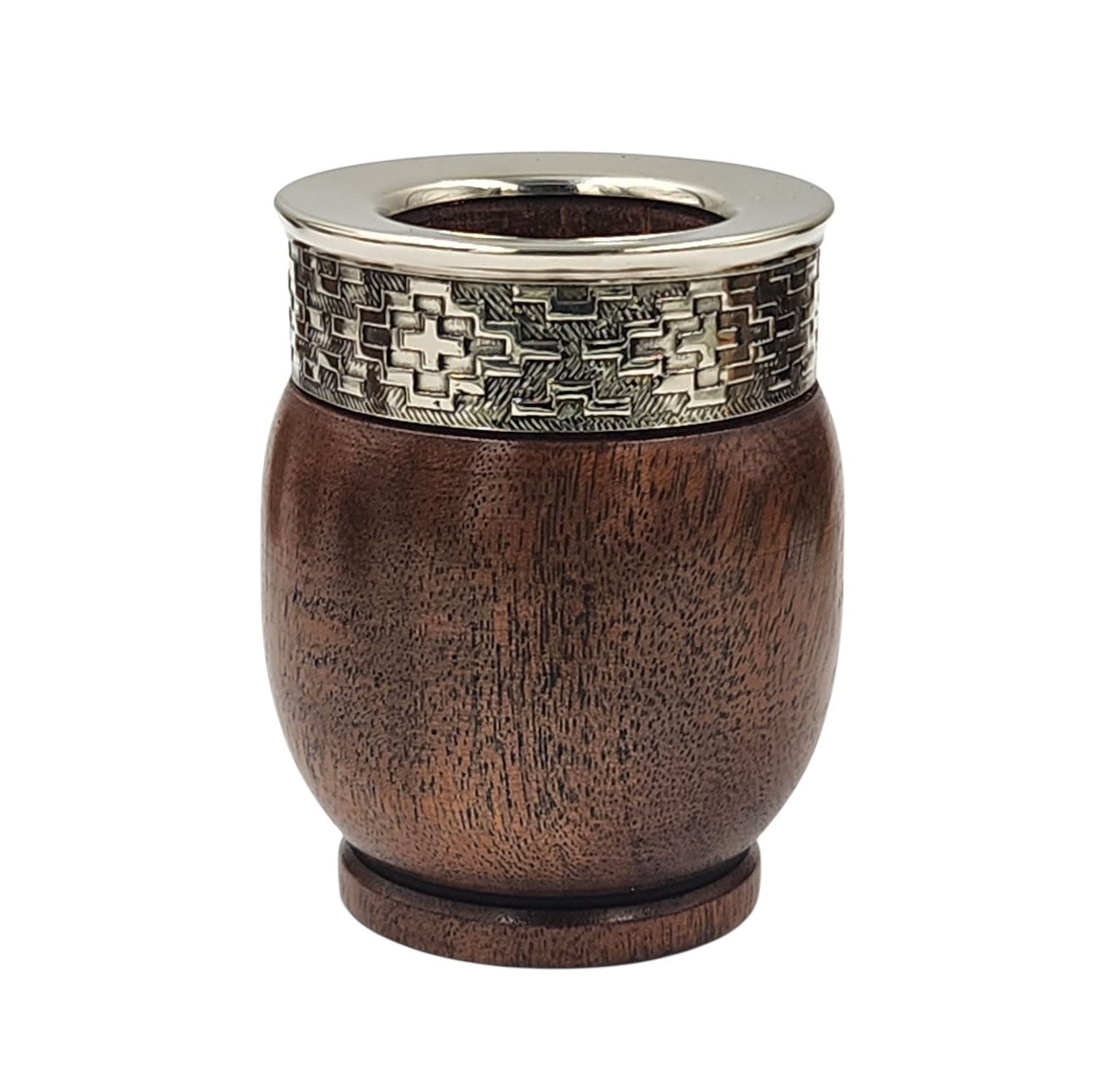Mate imperial  mini lord de excelente calidad en madera maciza de algarrobo con fleje en alpaca cincelada y virola de acero inoxidable.