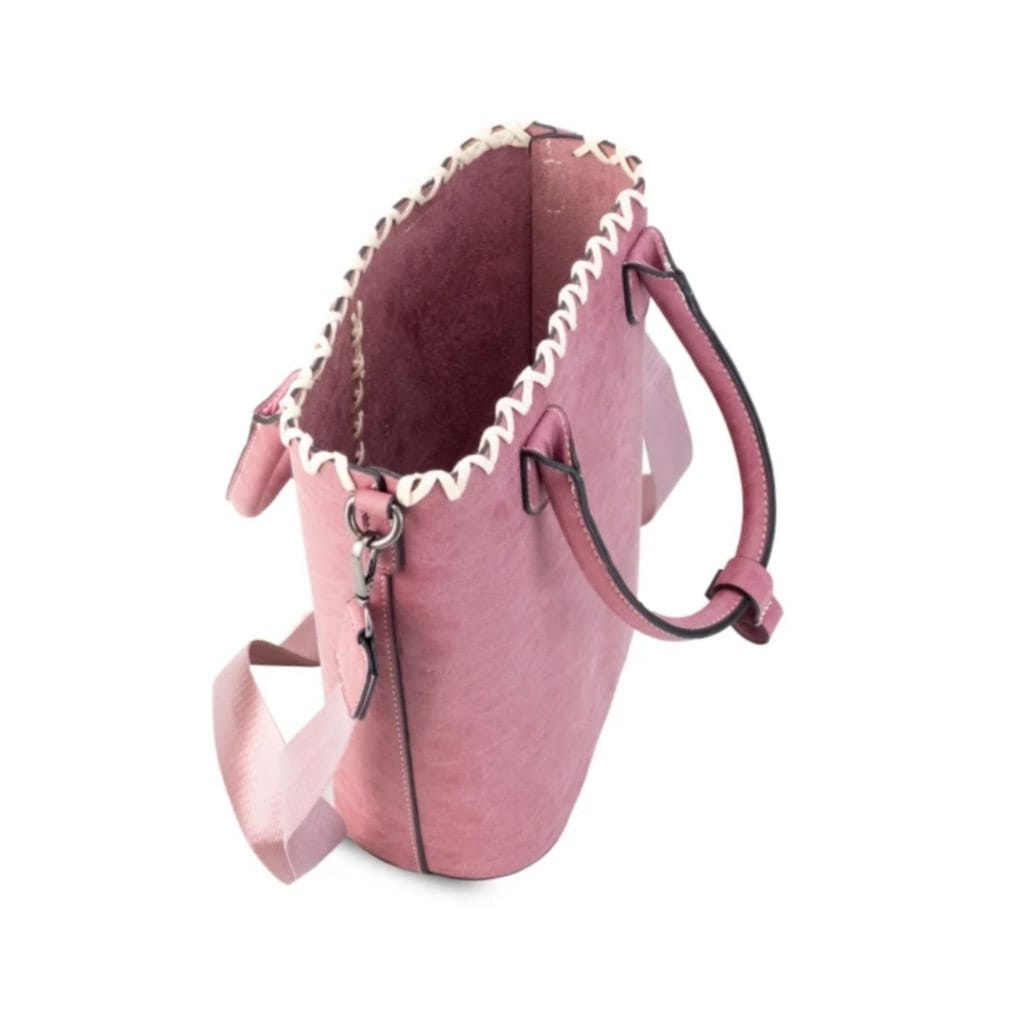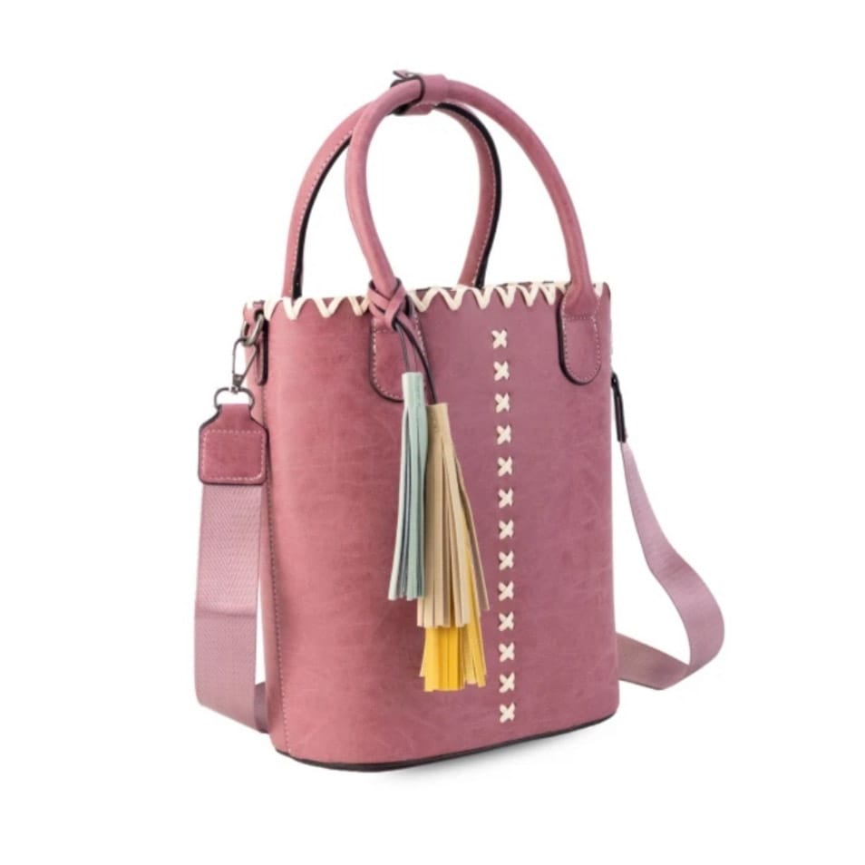 Matera en símil cuero, con costuras cruzadas decorativas y flecos multicolor.