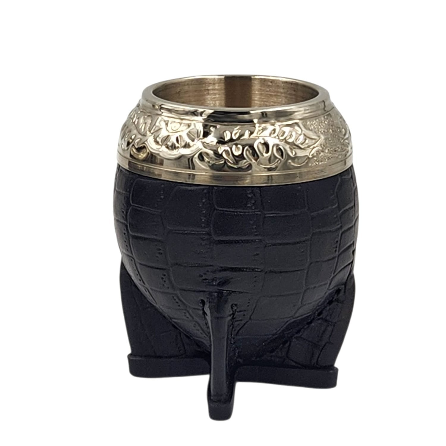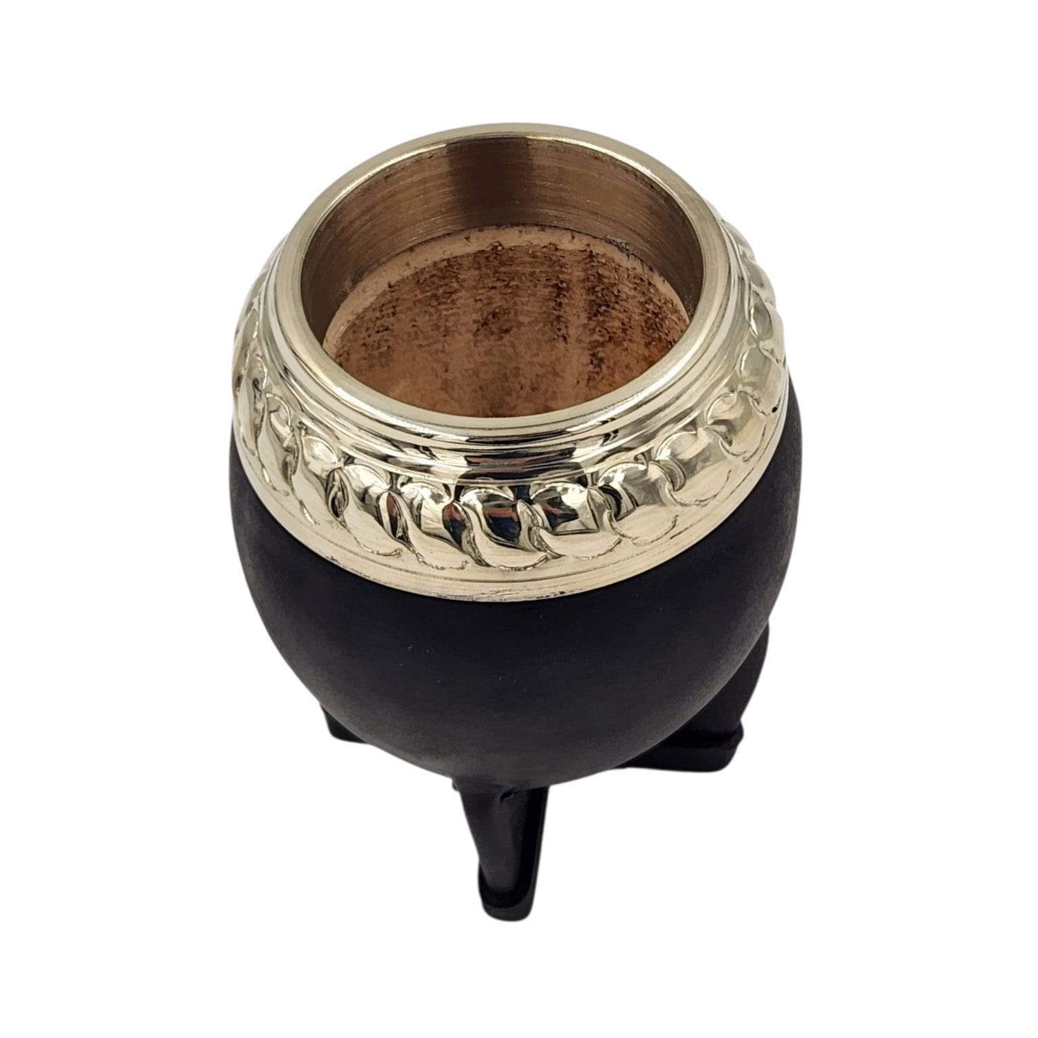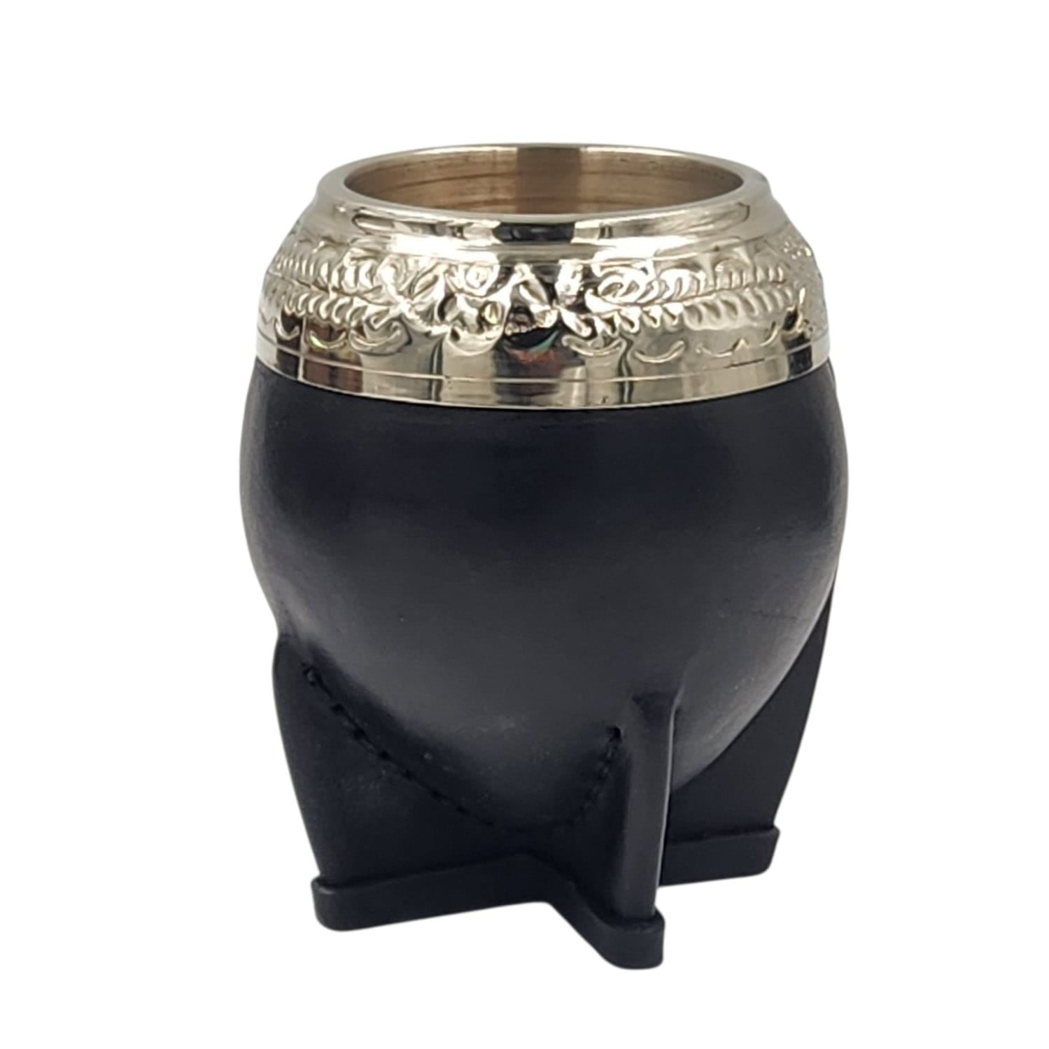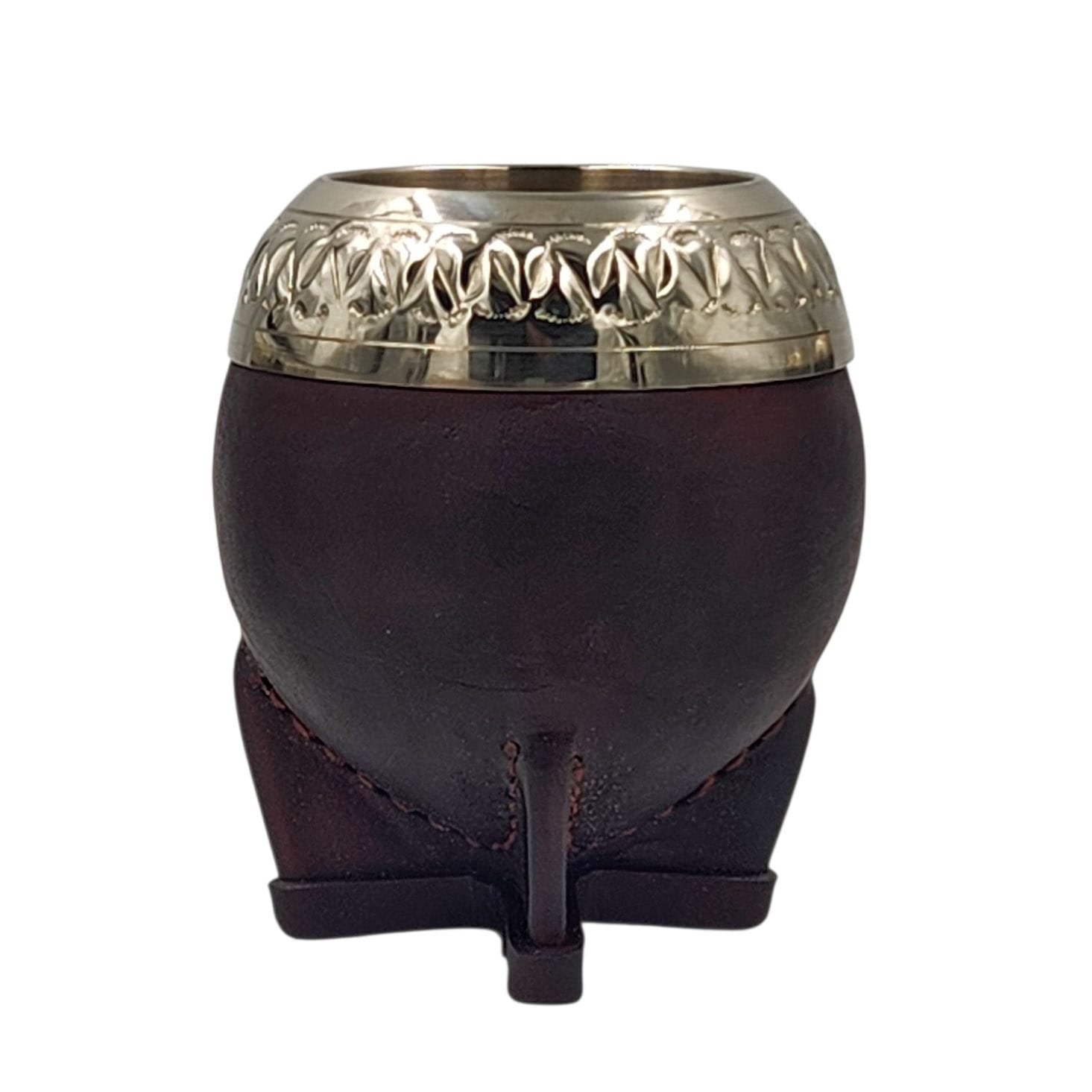 Calabaza revestida en cuero genuino con virolón de alpaca cincelada.